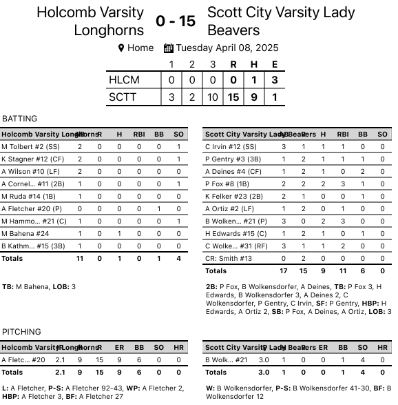 The Lady Beavers would score three in the first, and two in the second inning to lead 5-0. Holcomb would have their first baserunner on a walk in the second inning. They would collect their first hit of the game in the top of the third. Scott City would force Holcomb to strand three baserunners in three innings. The Lady Beavers would put the game away for good in the bottom of the third with 10 runs, to end the game 15-0 with one out in the bottom of the inning.