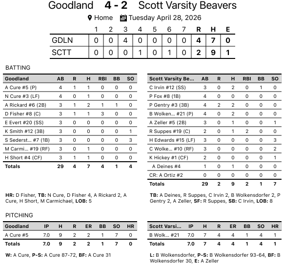 The opener would be a defensive battle. Following two scoreless innings, Goodland would be the first to strike, as they got an RBI single, and a three-run home run from Dani Fisher to give the Cowgirls a 4-0 lead. Scott City would put a run on the board in the fourth on a sac fly from Riley Suppes, and Suppes would score Peyton Gentry on a RBI single in the sixth. The Lady Beavers would leave several runners in scoring position in the final two innings, as they fell 4-2.