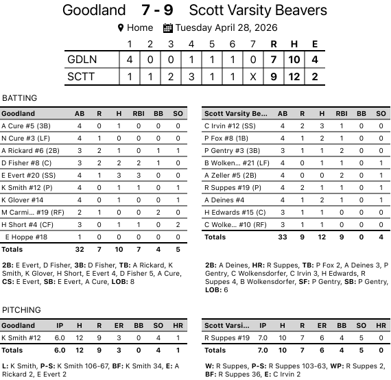 Goodland got out quickly with a four-run first inning. Scott City would slowly get back in to the game, with a run in the first and second innings, and tie the game in the bottom of the third. After the Cowgirls went ahead 5-4 in the top of the fourth, the Lady Beavers would grab the lead for good with three runs. The teams would trade runs in the fifth and sixth, which was highlighted by a two-out solo home run by Riley Suppes to put Scott City up 9-7. The Lady Beavers retired Goodland in order in the seventh to preserve the split 9-7.