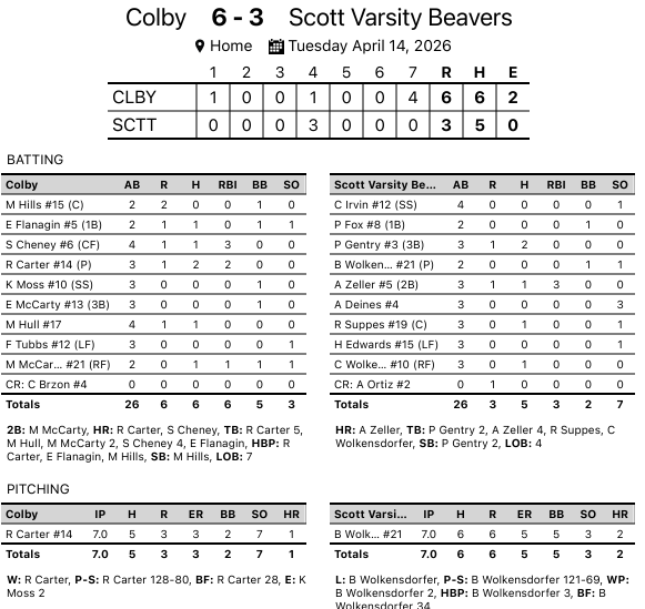Carter went the distance, giving up three runs on five hits with seven strikeouts. Cheney had three RBI and Ryler Carter had two hits and drove in two runs. Baylee Wolkensdorfer took the loss, giving up six runs, five earned, on six hits with three strikeouts. Peyton Gentry had two hits with a run scored, and Adalei Zeller drove in three runs.
