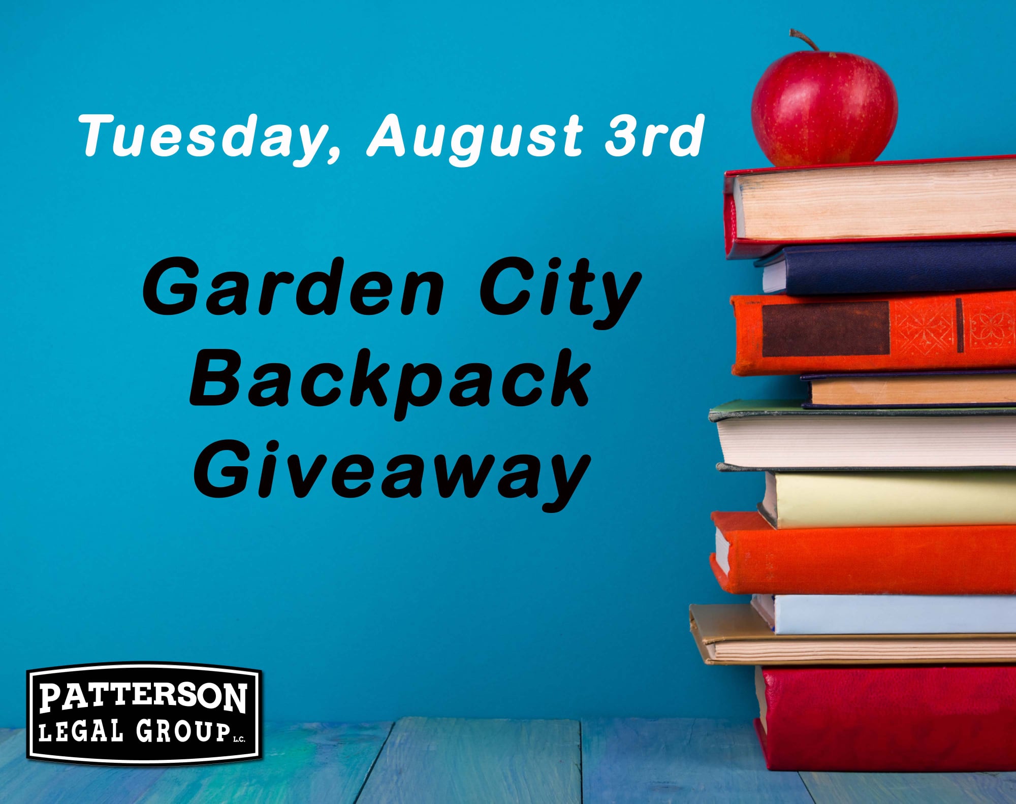 Patterson Legal Group in Garden City will be giving away free backpacks to local students in need of new school bags and supplies. The bags will be available Tuesday, August 3rd from 5:30 P.M. to 6:30 P.M. at the Paterson Legal Group location in Garden City.