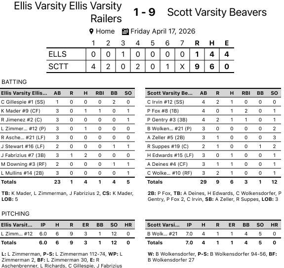 Piper Fox had a hit and drove in tow runs, as the Lady Beavers collected six hits in the opner. Baylee Wolkensdorfer threw 94 pitches in the opener, allowing a run on four hits and had five strikeouts. Ellis/Quinter saw starting pitcher Lyla Zimmerman go six innings, giving up nine runs, three earned, on six hits, with 12 strikeouts.