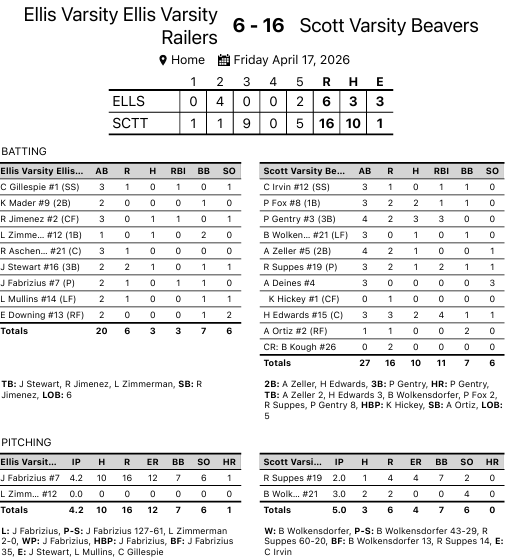 Scott City 16, Ellis/Quinter 6, Game 2 (5 Inn.)