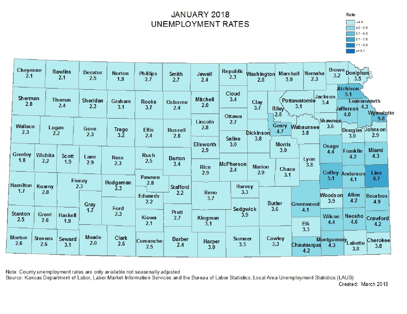 Garden City, KS(westernkansasnews.com) The Kansas Department of Labor has released it’s January Labor Market Report. The data shows a seasonally adjusted unemployment rate of 3.5 percent for the state. The same as December, but down from 3.9 percent in January 2017.