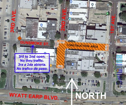 Dodge City, Kan.–Starting Tuesday, January 14th, following the reopening of Gunsmoke Street between 3rd Avenue and 2nd Avenue, construction will shift to the next section of Gunsmoke Street between 2nd Avenue and 1st Avenue. Please note that the intersection of 2nd Avenue and Gunsmoke Street will remain closed, along with the section of 2nd Avenue between Front Street and Gunsmoke Street. With that said, sidewalks will remain open for pedestrians to access businesses.