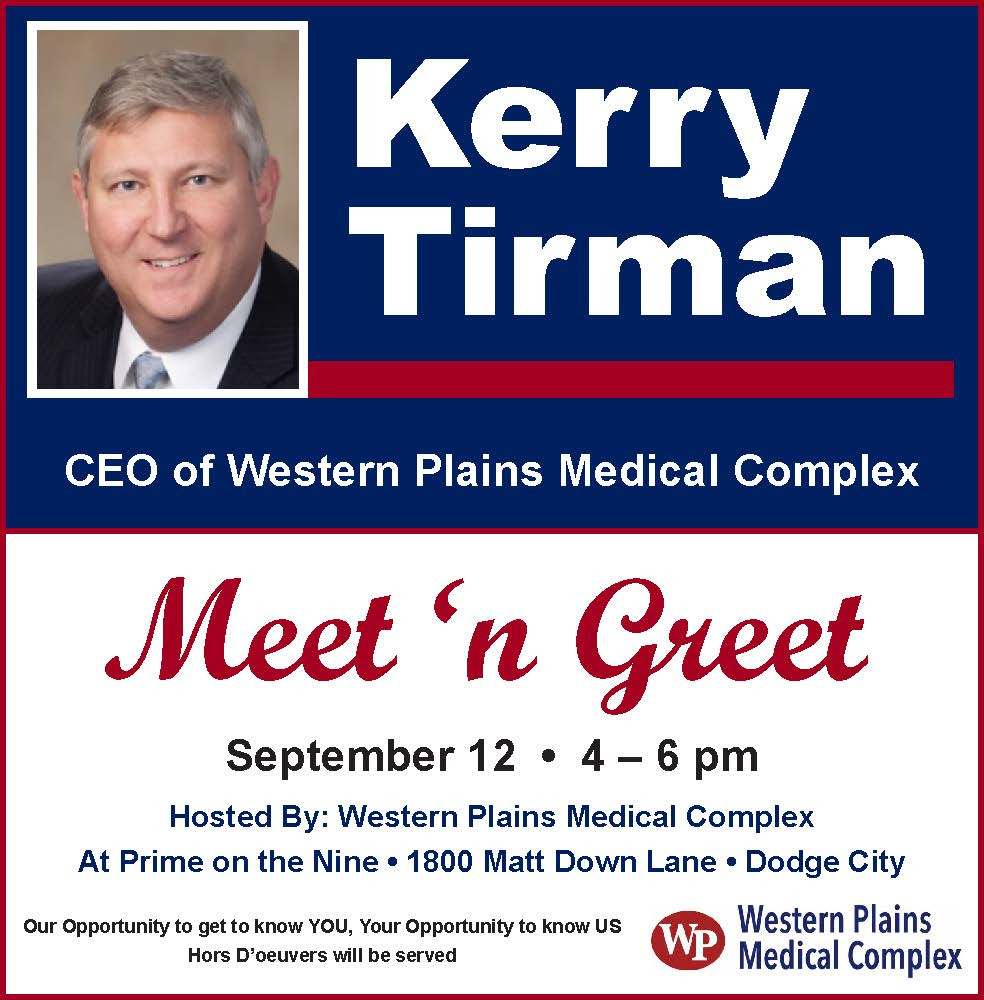 Dodge City, KS(westernkansasnews.com) Western Plains Medical Complex is holding a Meet n greet for new CEO Kerry Tirman on Tuesday. The event is from 4-6 at Prime on the Nine located at 1800 Matt Down Lane in Dodge City. Tirman says the event is designed to connect with the community.